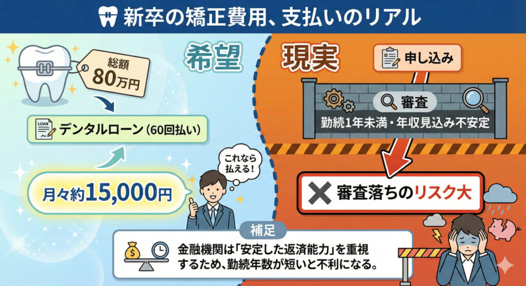 新卒の手取り給与が約20万円前後だとすると、一括払いは現実的ではありませんよね。そこで多くの方が検討するのが「デンタルローン」です。これを使えば、月々の支払いを1〜2万円程度に抑えることができ、手取りの範囲内でも無理なく支払っていくことが可能です。