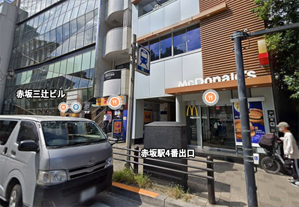 ② 4番出口をでるとすぐ隣にガラス張りの”赤坂三辻ビル”があります。